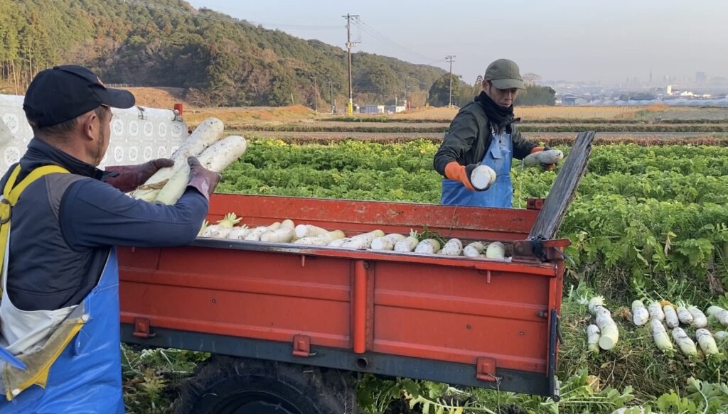抜き取った大根は畝に並べ、葉の部分を包丁で切り落としてから運搬車へ積んでいきます。